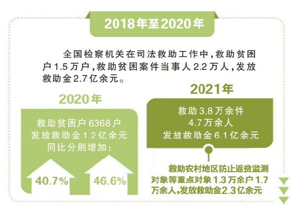 记者从最高检了解到,2018年至2020年,全国检察机关在司法救助工作中,救助贫困户1.5万户,救助贫困案件当事人2.2万人,发放救助金2.7亿余元。其中,2020年救助贫困户6368户,发放救助金1.2亿余元,同比分别增加40.7%和46.6%。2021年,救助3.8万余件4.7万余人,发放救助金6.1亿余元。其中,救助农村地区防止返贫监测对象等重点对象1.3万余户1.7万余人,发放救助金2.3亿余元。据最高检第十检察厅厅长徐向春介绍:“融入、服务、保障脱贫攻坚大局的显著成效,也带动提升了检察机关整体司法救助工作的快速发展。检察机关将接续融入、服务和保障全面实施乡村振兴战略,充分、全面地履行好司法救助职责,实实在在发挥‘救急解困’功能作用,展现‘司法为民’的政治担当。”